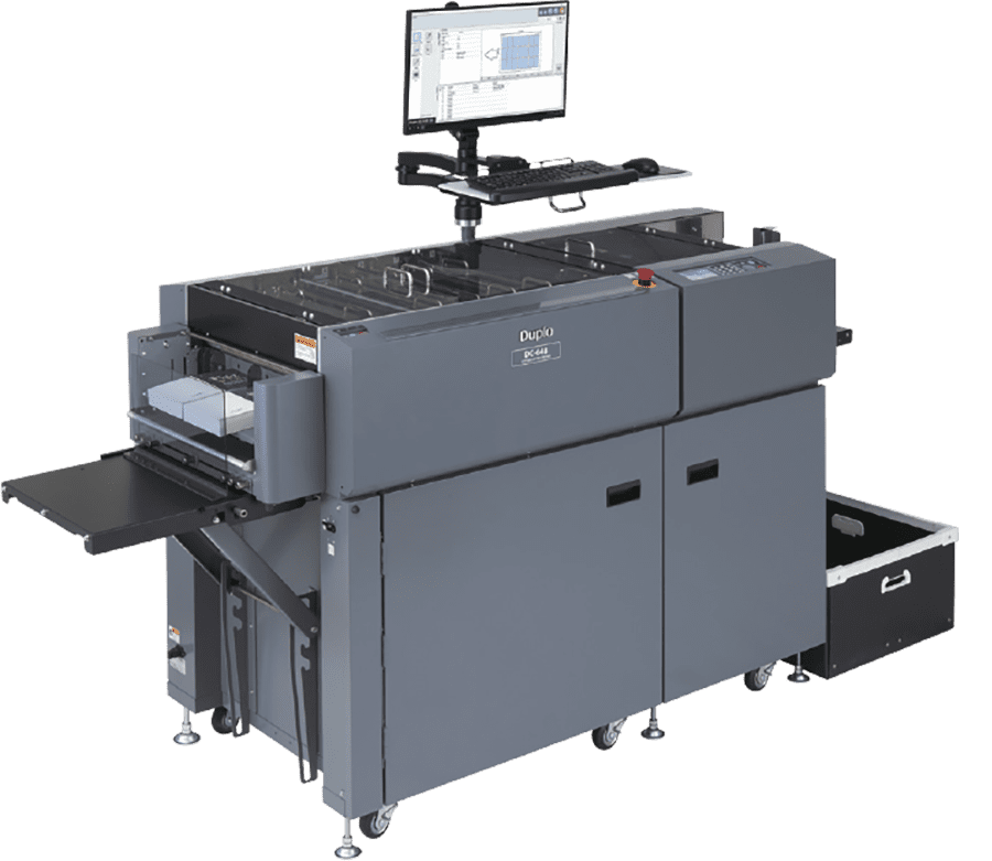 A Duplo DC-648 é uma solução de acabamento totalmente automatizada que combina corte, vinco e refilo em um único equipamento de alta precisão. Projetada para médias e grandes produções, oferece acabamento completo em uma única passagem, com velocidade de até 40 folhas por minuto. Ideal para eliminar etapas manuais e aumentar a eficiência em gráficas e centros de impressão digital.